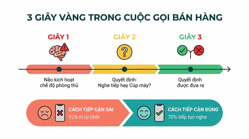 Não bộ khách hàng đã “học thuộc” cách sales mở đầu cuộc gọi. Nhiệm vụ của bạn là phá vỡ pattern này để họ không kịp kích hoạt nút “cúp máy tự động”.